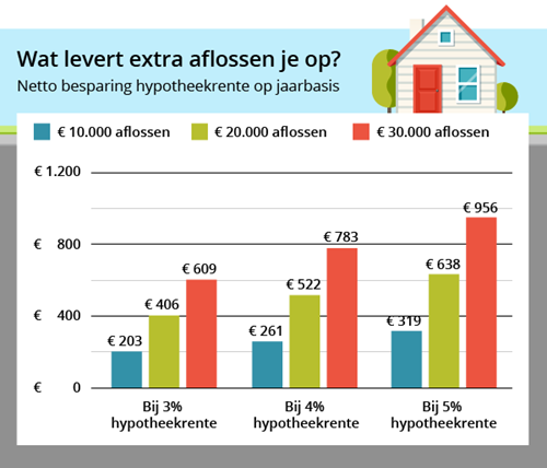 Een voorbeeld: Je lost € 20.000 af op je hypotheek met 4% rente. Qua hypotheekrente scheelt dit je netto € 522 per jaar. Daarnaast betaal je € 240 minder vermogensrendementsheffing. Aflossen levert je dus € 762 op.