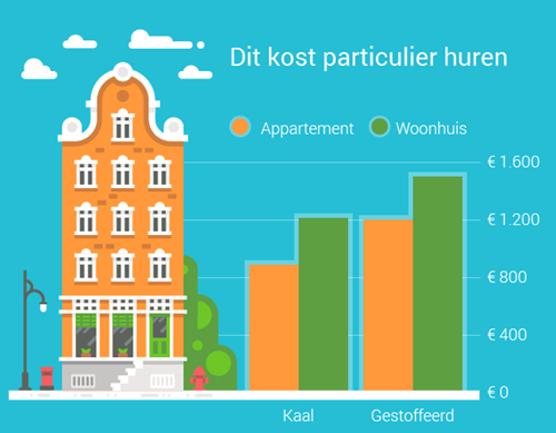 Een kaal appartement is gemiddeld 87 m2 groot. De prijs per m2 is op dit moment € 10,02. Je betaalt daarmee aan kale huur gemiddeld € 890 per maand. Kies je voor een gestoffeerd huurappartement, dan betaal je € 13,97 per m2, ofwel: € 1.215 per maand. Beide tarieven zijn nog exclusief servicekosten. Bij een gemiddeld woonhuis van 137 m2 liggen de tarieven op € 1.200 voor een kale huurwoning en € 1.500 voor een gestoffeerd huis.