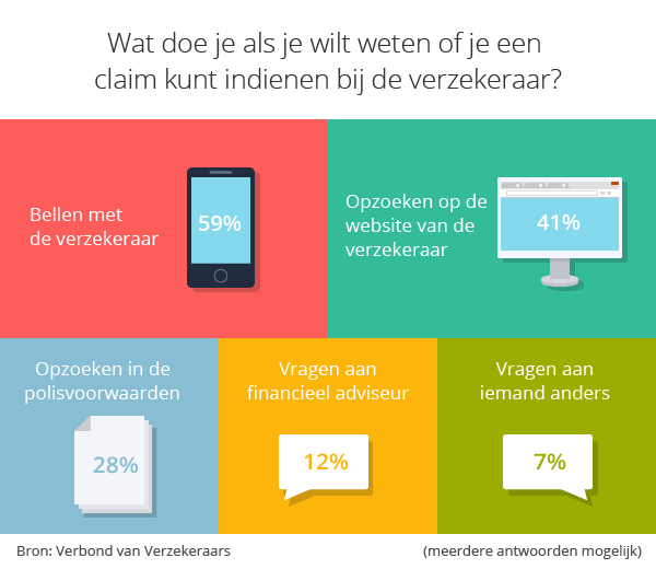 Of een verzekeraar de schade vergoedt, moet dan blijken uit een telefoontje met de maatschappij (59%) of via een speurtocht op de website van de verzekeraar (41%). Slechts 28% slaat zelf de polisvoorwaarden open.