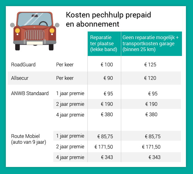 Of je met prepaid pechhulp goedkoper uit bent, hangt helemaal af van het aantal keer dat je daadwerkelijk autopech hebt. Bij bijvoorbeeld vier keer een lekke band in één jaar heb je juist hogere kosten (€ 360 / € 400) dan wanneer je dat jaar een abonnement had.