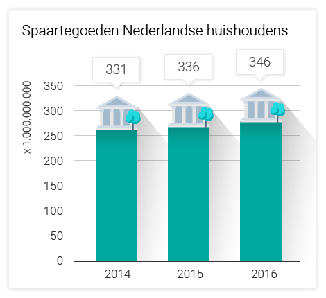 Of de ECB haar doel bereikt, is nog maar de vraag. Ondanks de lage spaarrente staat bijna 85% van alle spaartegoeden in Nederland op vrij opneembare spaarrekeningen. Eind augustus was dat bijna 346 miljard euro. Zowel in 2014 (331 miljard ) als in 2015 (bijna 336 miljard) was dat bedrag lager. De overige 15% van de spaartegoeden (ruim 52 miljard euro) staat op deposito’s met een vaste looptijd en een gemiddelde rente van 1,75%.