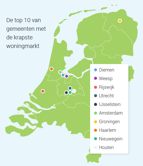 Wat opvalt is dat de krapte van de grote steden overslaat naar de voorsteden. Diemen en Weesp bij Amsterdam, IJsselstein, Nieuwegein en Houten bij Utrecht. De druk spreidt zich verder uit.