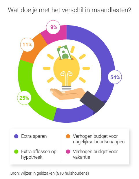 De meeste huishoudens (54%) gebruikte het maandelijkse voordeel om extra te sparen. Een kwart loste extra af op de hypotheek. De overige huishoudens (11%) gaven meer uit in de supermarkt (11%) of gaven het uit aan vakanties (9%).