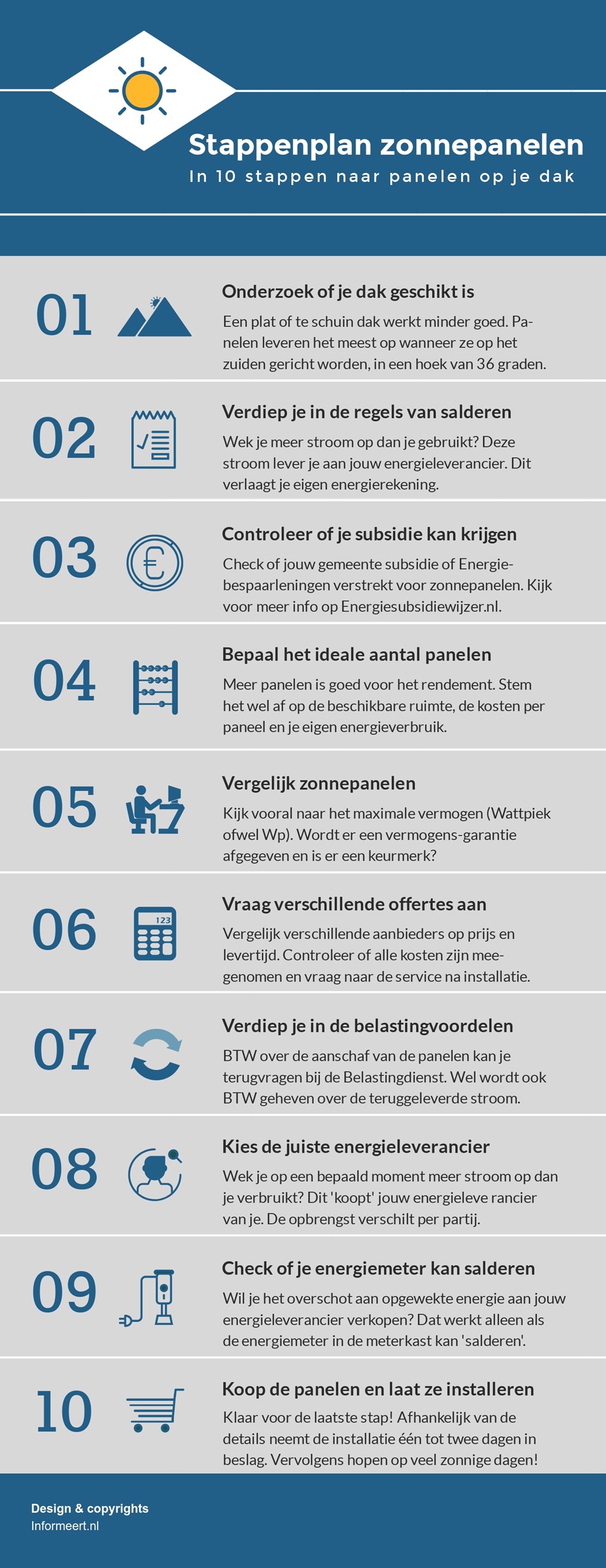 Het opwekken van stroom met zon, water of wind is niet het specialisme van . Vraag ons dan ook niet welk soort paneel jij het best op je dak kan leggen of wat de exacte opbrengst is van een bepaald type. Wel helpen we je graag op weg met de onderstaande infographic. Met het stappenplan bepaal je of de installatie van zonnepanelen iets voor jou is en hoe het aan te pakken.