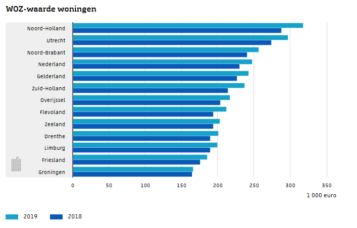In alle provincies nam de WOZ-waarde toe, al gaat het in Groningen om een minieme stijging. Op plaatselijk niveau is Rotterdam koploper met een stijging van € 26.000 (16%). Amsterdam blijft achter met ‘slechts’ 11 procent. Over een langere periode staat de hoofdstad wel op nummer één, met een stijging van 64 procent sinds 2014.