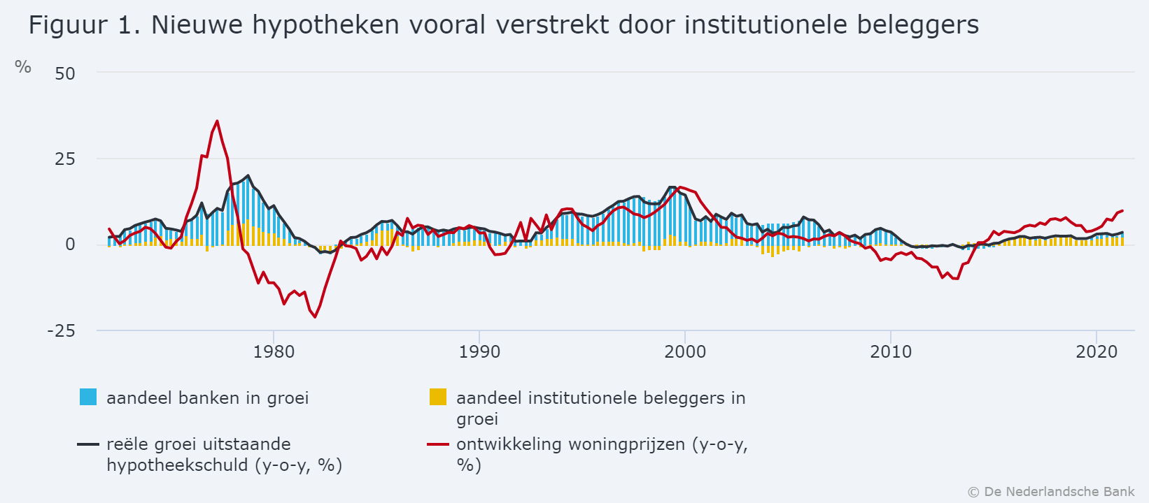 In de afgelopen decennia profiteerden vooral banken van het toenemend aantal afgesloten hypotheken. Sinds 2014 zijn de verhoudingen verschoven. Vanaf dat moment groeide de hypotheekportefeuille van banken met 12 miljard euro. Institutionele beleggers - verzekeraars, pensioenfondsen en beleggingsinstellingen zagen hun aandeel met 82 miljard euro veel sterker groeien. Let wel, het gaat hierbij om de toename in het aantal nieuw afgesloten hypotheken. Van alle hypotheken bij elkaar, zowel nieuw als bestaand, staan banken nog steeds aan kop.