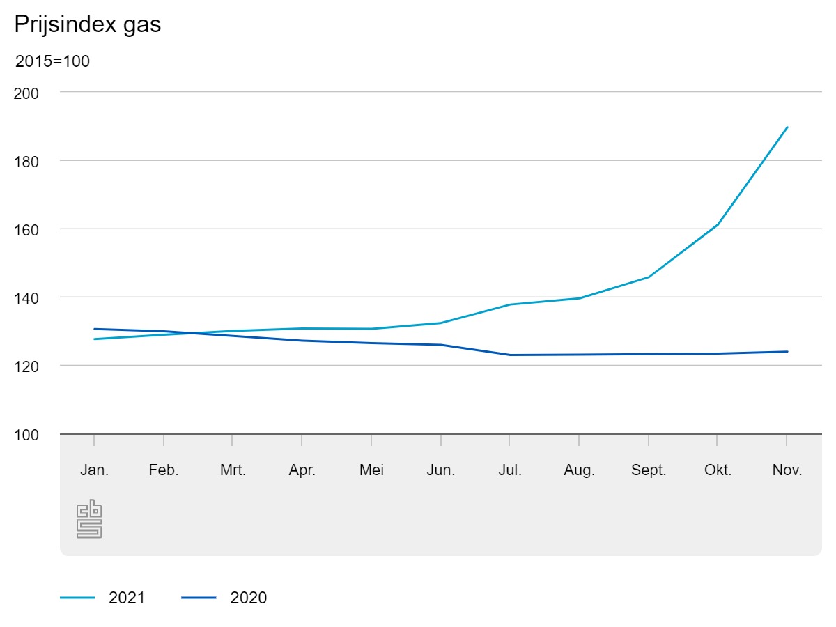 Vooral de prijzen van gas en elektra hebben bijgedragen aan stijgende kosten. Zo was gas in november 53 procent duurder dan in dezelfde maand een jaar eerder. Elektriciteit is zelfs 74,9 procent duurder. De stijgende energieprijzen zijn ook terug te zien aan de pomp. Een liter benzine aan de pomp kost nu gemiddeld 2,01 euro, terwijl dit een jaar geleden nog €1,52 was. Zonder het meetellen van de energieprijzen zou de inflatie rond de drie procent bedragen.