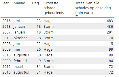 Het verbond illustreert in haar klimaatmonitor welk weertype de grootste schade veroorzaakt. Kijken we naar de periode vanaf 2007, dan staat storm op nummer 1 met 47 procent van de totale schadelast. Als het gaat om de grootste schade op 1 dag is hagel de winnaar. Op 23 juni 2016 bedroeg de schade door hagelbuien 482 miljoen euro.
