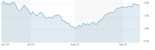 De rente op staatsleningen is een goede graadmeter voor langer lopende hypotheekrentes. Geldverstrekkers houden bij het vaststellen van de hypotheekrentes rekening met het verloop van deze staatsrente. Onderstaand zie je de dip in augustus. Vooral door de toenemende onrust en hoge inflatie is de staatsrente weer opgelopen in de afgelopen weken. Mogelijk is de stijging nog niet door alle geldverstrekkers verwerkt in de tarieven.