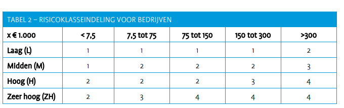 Voor de waarde van de goederen geldt: des te hoger de waarde, des te groter het risico. Aan de hand van een tabel kun je zien in welke risicoklasse jouw onderneming valt. Met deze online tool van het CVV krijg je hier online inzicht in.