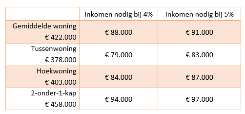 De daling van de huizenprijzen lijkt intussen weer voorbij en de NVM rapporteerde dat de woningprijzen op kwartaalbasis weer zijn gestegen. In combinatie met de gestegen hypotheekrente wordt het kopen van een woning steeds lastiger. Hieronder vind je een overzicht hoeveel je ongeveer moet verdienen om een woning te kopen bij verschillende rentestanden. De prijzen van de woningen zijn gebaseerd op het recent verschenen NVM-rapport.