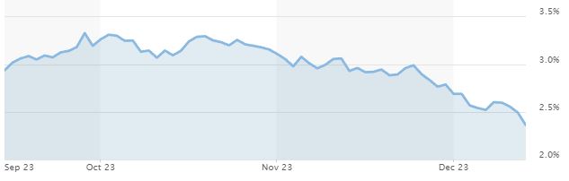 In de afgelopen maanden dalen veel belangrijke rentes. Een voorbeeld is de rente op een Nederlandse staatsobligatie. Dit kun je zien als een lening aan de Nederlandse staat, voor een periode van tien jaar. De rente hierop is een graadmeter voor bijvoorbeeld hypotheken met een rentetermijn van 10 jaar en langer. Over het algemeen volgen deze rentes die van de staatsleningen. Goed te zien is de versnelling van de daling in de afgelopen dagen.